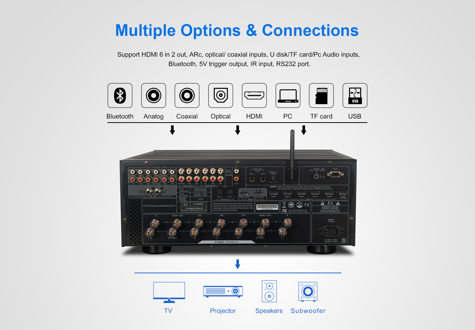 L'AT-2300PRO est un Récepteur AV Dolby Atmos/DTS:X 7.1 , qui intègre une gestion dynamique intelligente de l'alimentation et des circuits de classe H, assurant une allocation précise et en temps réel de l'énergie pour les scénarios multicanaux.