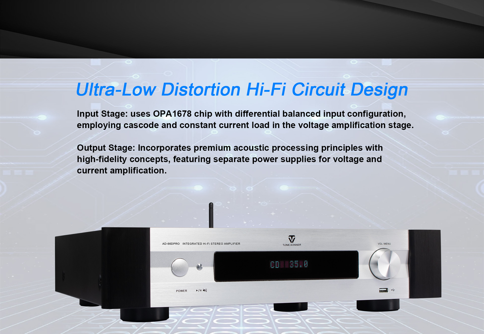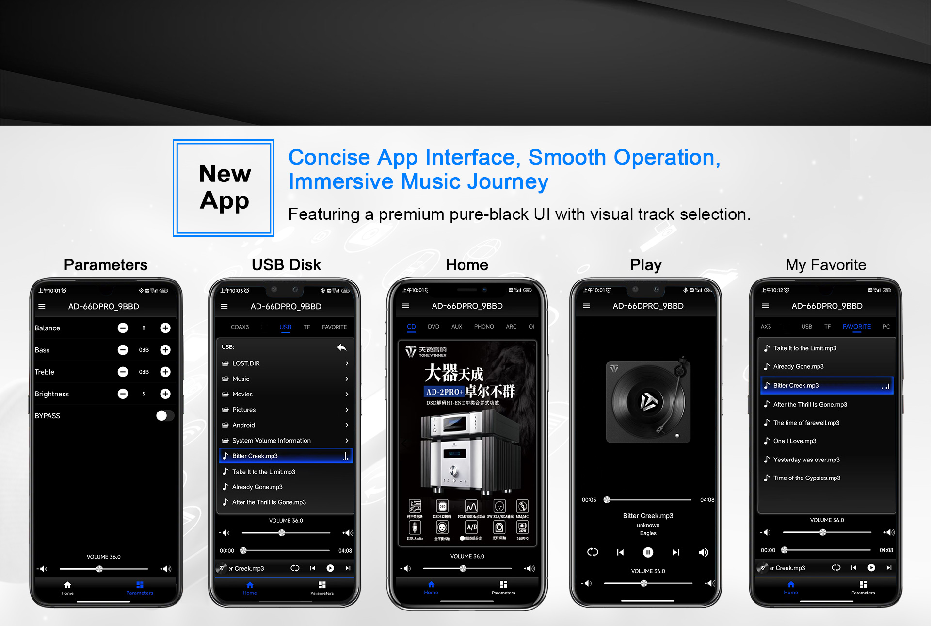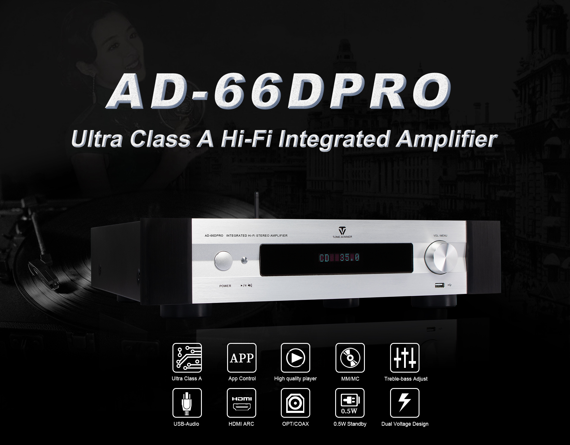 L'AD-66DPRO est une version améliorée de l'AD-66D. Il est doté d'une nouvelle interface phono MM/MC et d'une nouvelle application mobile. L'AD-66DPRO conserve les atouts majeurs de l'AD-66D et les enrichit de nouvelles fonctionnalités ; c'est un amplificateur Hi-Fi d'entrée de gamme fortement recommandé.