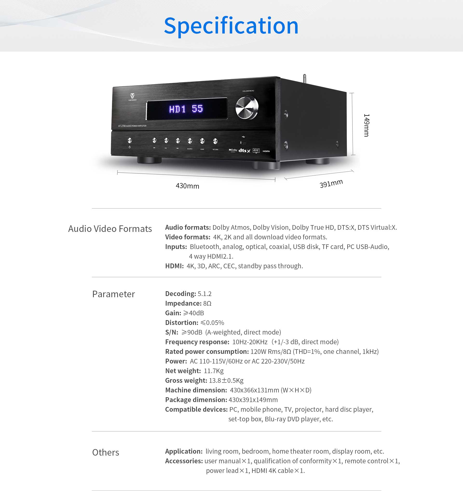 L'AT-2700 est un amplificateur audio-vidéo intégré compatible Dolby Atmos, DTS:X, 4K, Dolby Vision, HDR, etc. Il prend également en charge le décodage 5.1.2, le Bluetooth, 4 entrées et 2 sorties HDMI, la commande CEC, le menu OSD, le RS232, le contrôle via une application mobile, etc. Comptant parmi les 10 premières marques audio en Chine, Tonewinner bénéficie de plus de 30 ans d'expérience dans la conception et la fabrication de produits acoustiques. En tant que fournisseur d'origine, Tonewinner accueille chaleureusement les distributeurs, partenaires et clients du monde entier.