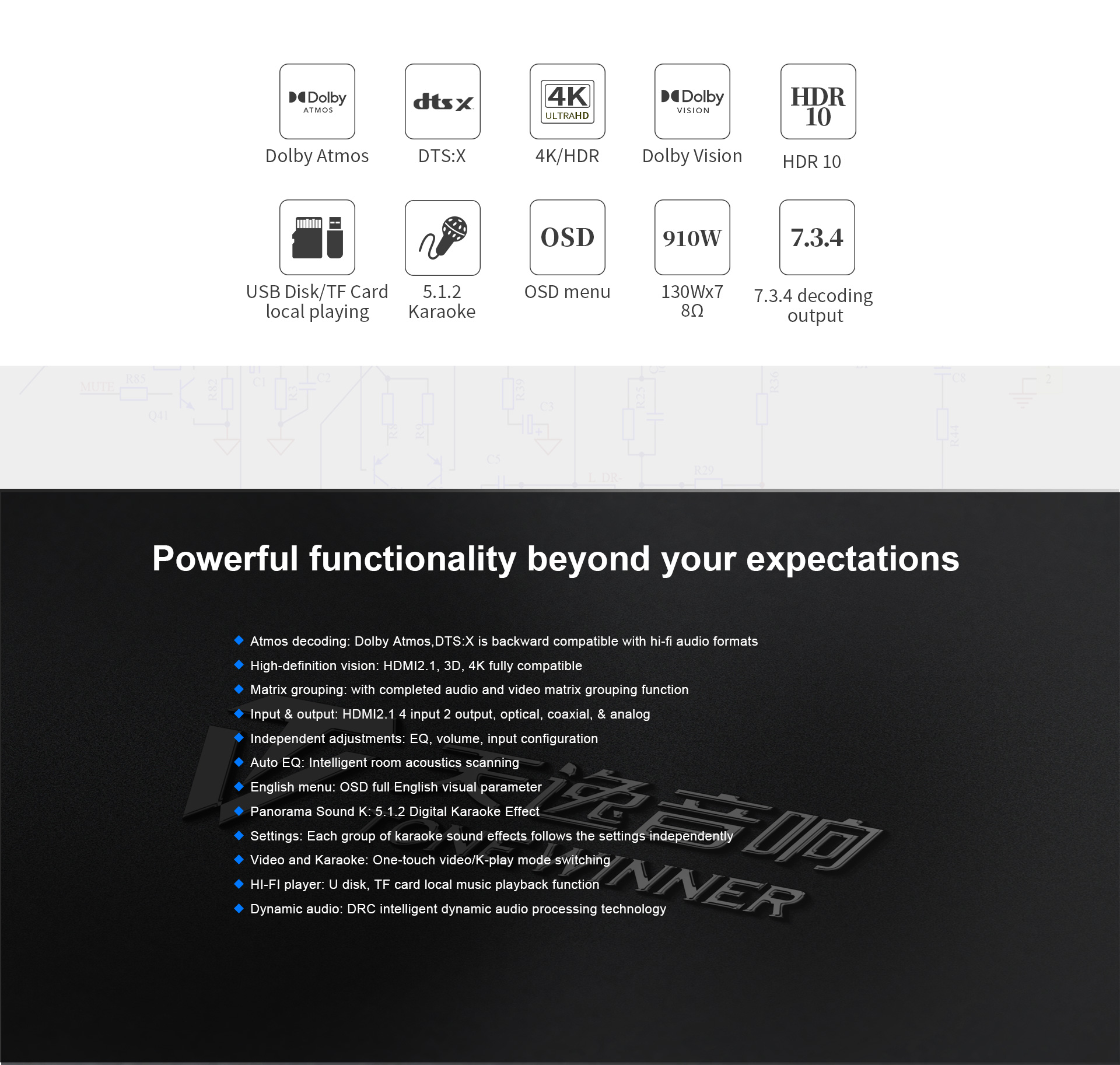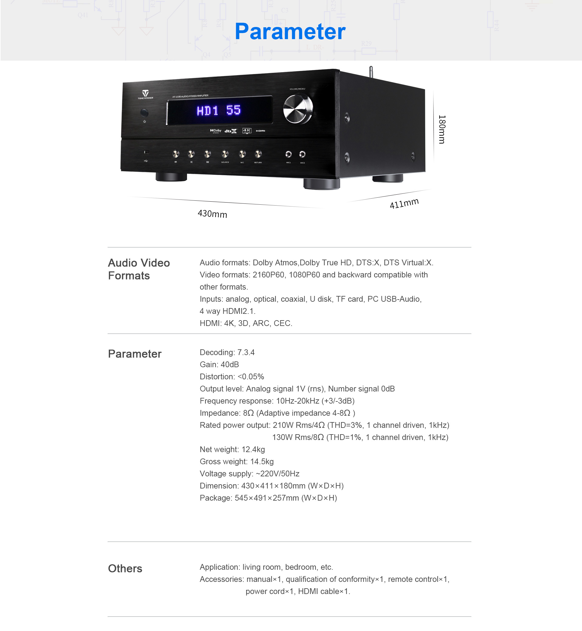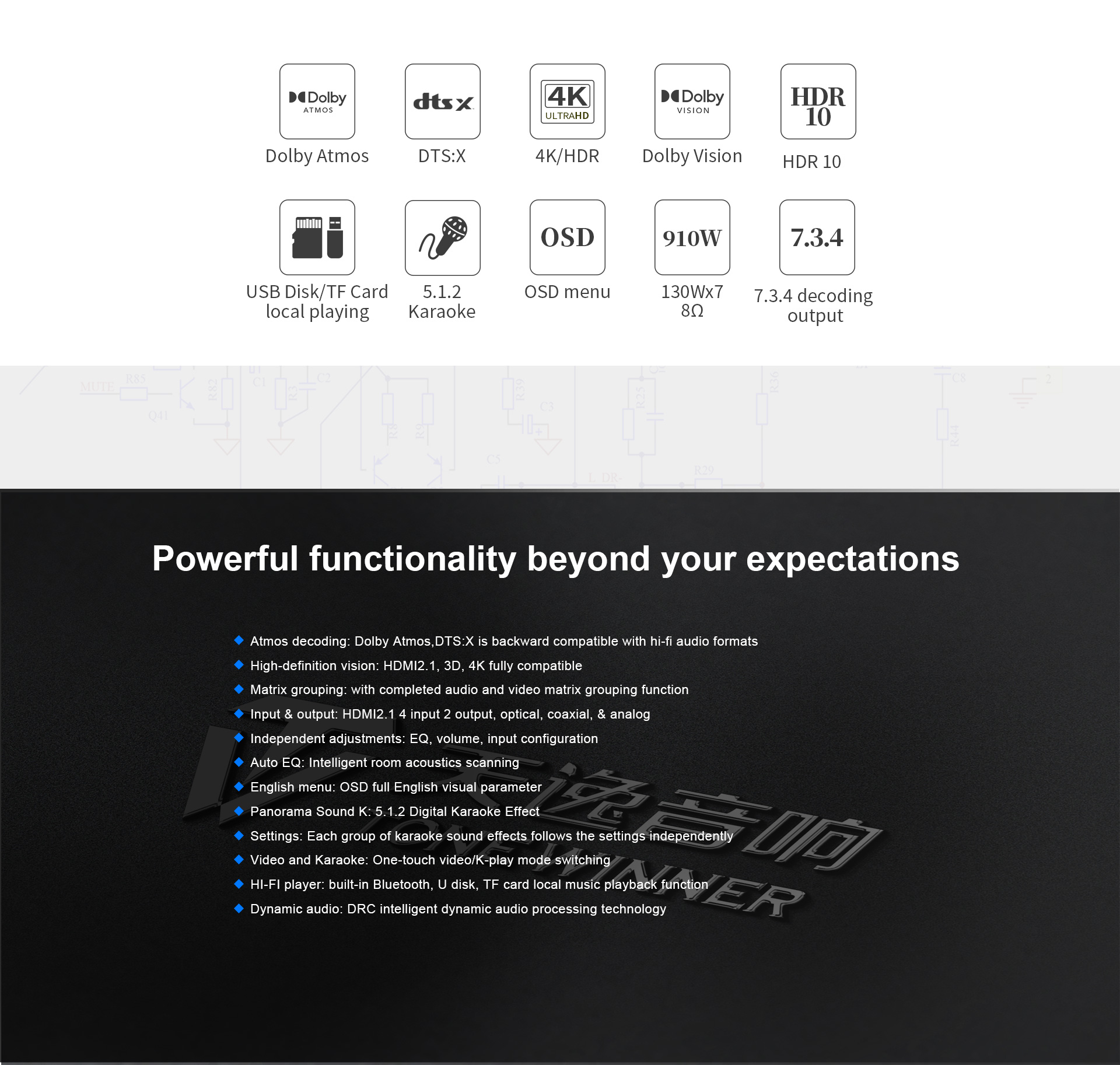 HDMI 4 entrées 2 sorties, prend en charge ARC, les entrées numériques optiques/coaxiales, les entrées audio USB/carte TF/PC, la transmission sans fil sans perte, la sortie de déclenchement 5V, l'entrée IR et le port de contrôle standard RS232.