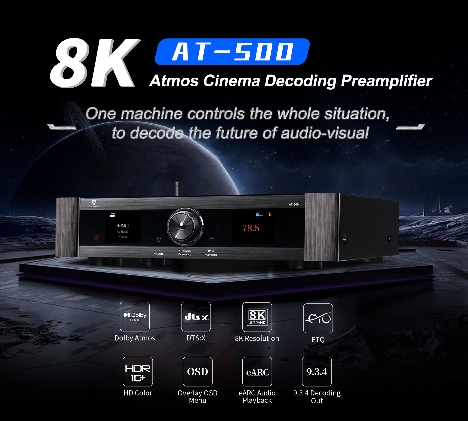L'AT-500 est un processeur AV immersif 8K conçu pour les salles de cinéma privées haut de gamme. Il prend en charge les effets audio immersifs Dolby Atmos et le son immersif DTS:X, ainsi que la technologie vidéo 8K. Il est également compatible avec les formats vidéo tels que la 3D, le HDR10+ et le Dolby Vision. Véritable plateforme audiovisuelle ultra haute définition, il intègre à la fois un système de cinéma et une chaîne hi-fi.