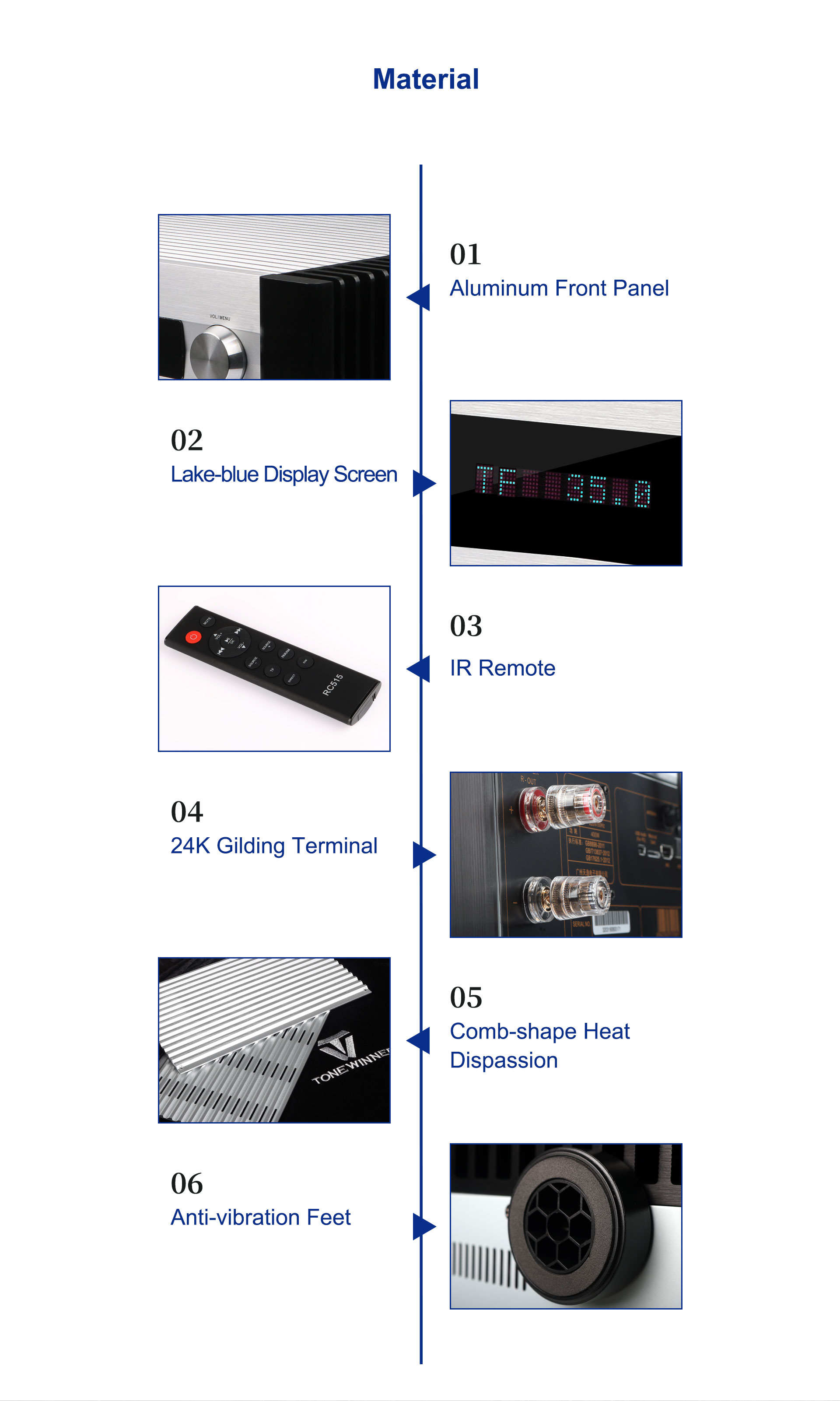 La partie préamplificateur utilise un amplificateur opérationnel haute fidélité, tandis que la partie amplificateur emploie des circuits d'amplification différentielle et huit transistors de puissance Toshiba TTC-5200/TTA1943. Un circuit de servomoteur long et un circuit de rétroaction négative approprié assurent la stabilité du fonctionnement de la machine, minimisent la distorsion et améliorent ses performances.