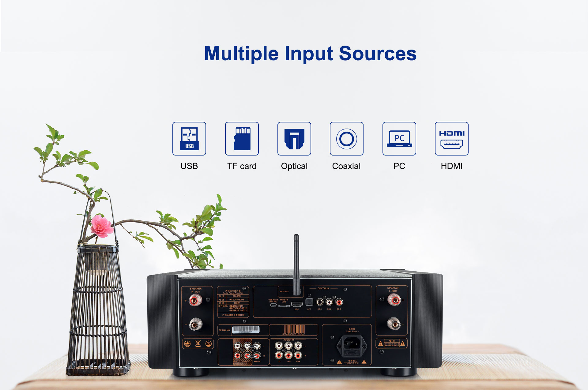 1 entrée audio USB pour PC, 1 entrée optique et 3 entrées coaxiales, prenant en charge le PCM 192 kHz/16 bits pour les appareils numériques.
