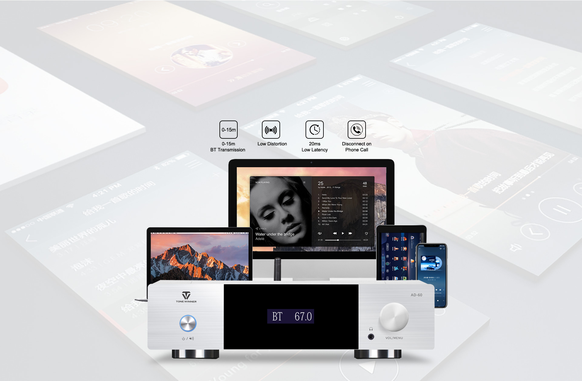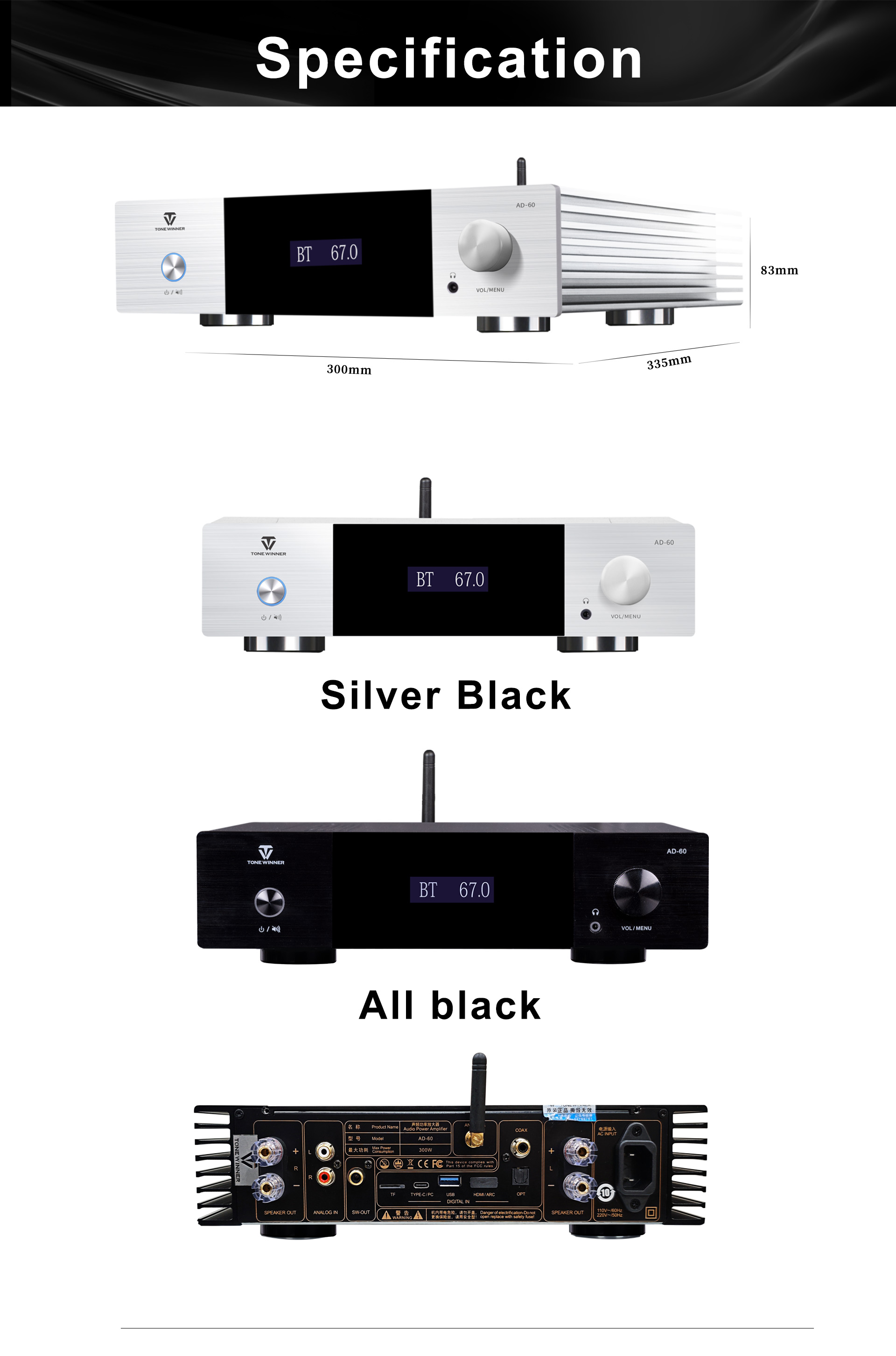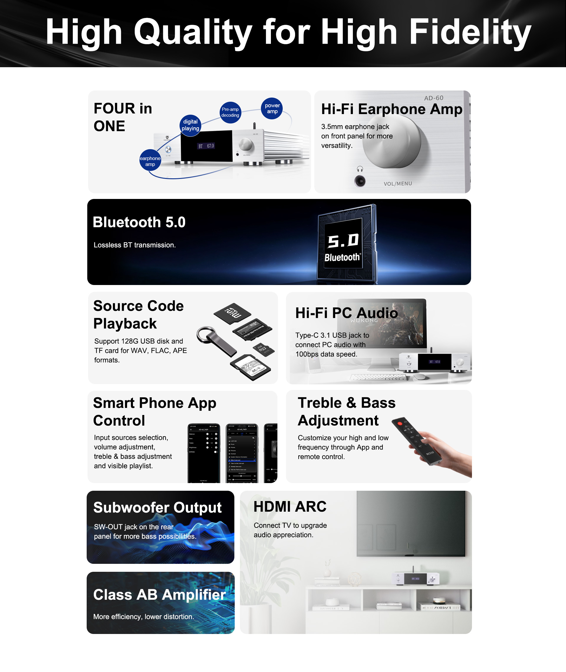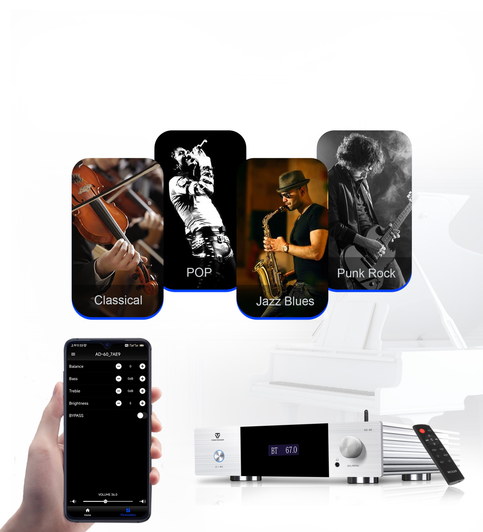L'AD-60 est un amplificateur de puissance intégré de classe AB compatible avec les systèmes 2.1. Il combine préampli, amplificateur de puissance, lecture numérique et amplificateur pour écouteurs. Il prend en charge le Bluetooth 5.0, les clés USB, les cartes TF, le contrôle via application mobile et les entrées numériques (optique, coaxiale et USB-Audio PC). Conçu et fabriqué avec des matériaux et composants de qualité, il révèle un son analytique. C'est un amplificateur de puissance élégant et économique pour un son haute fidélité.