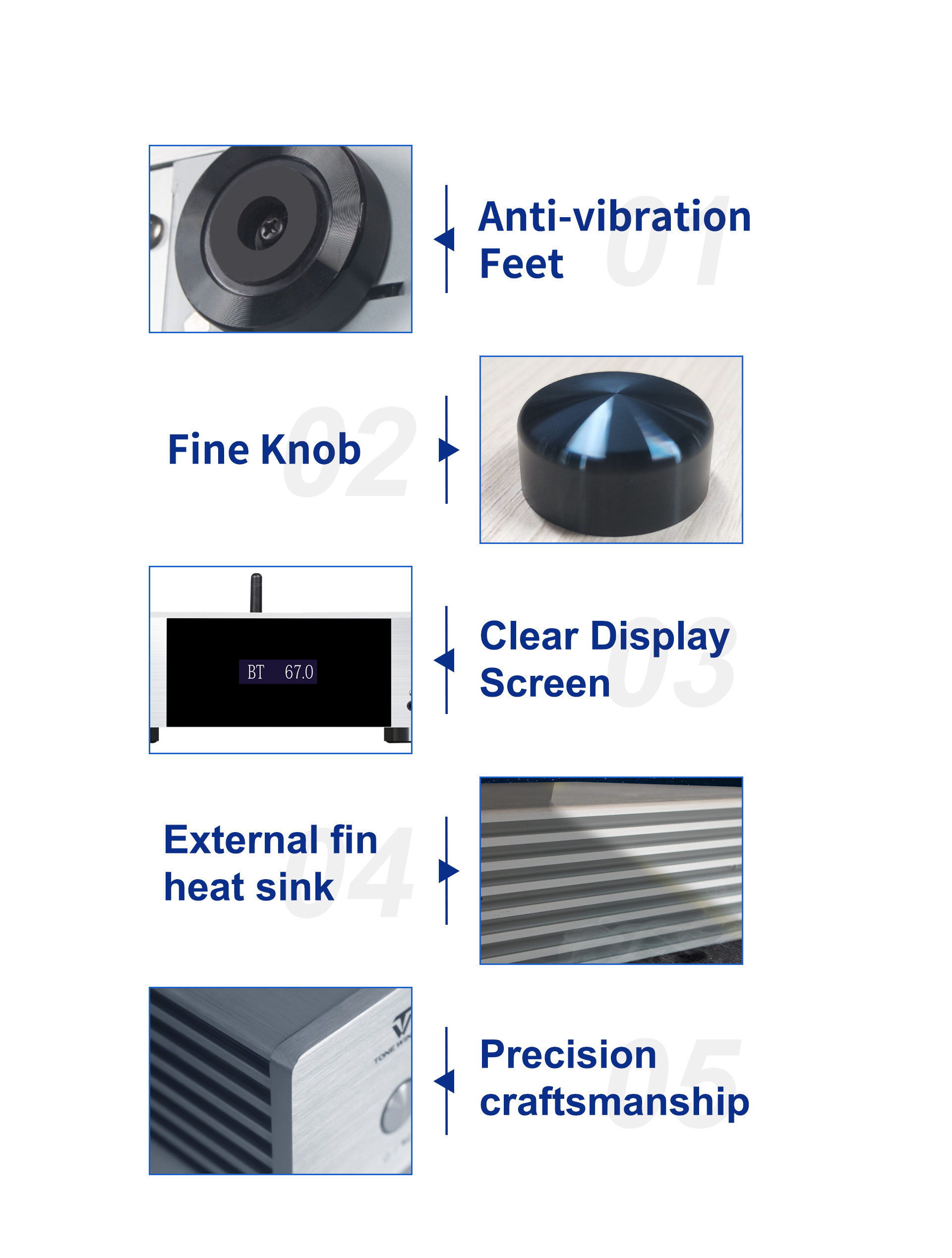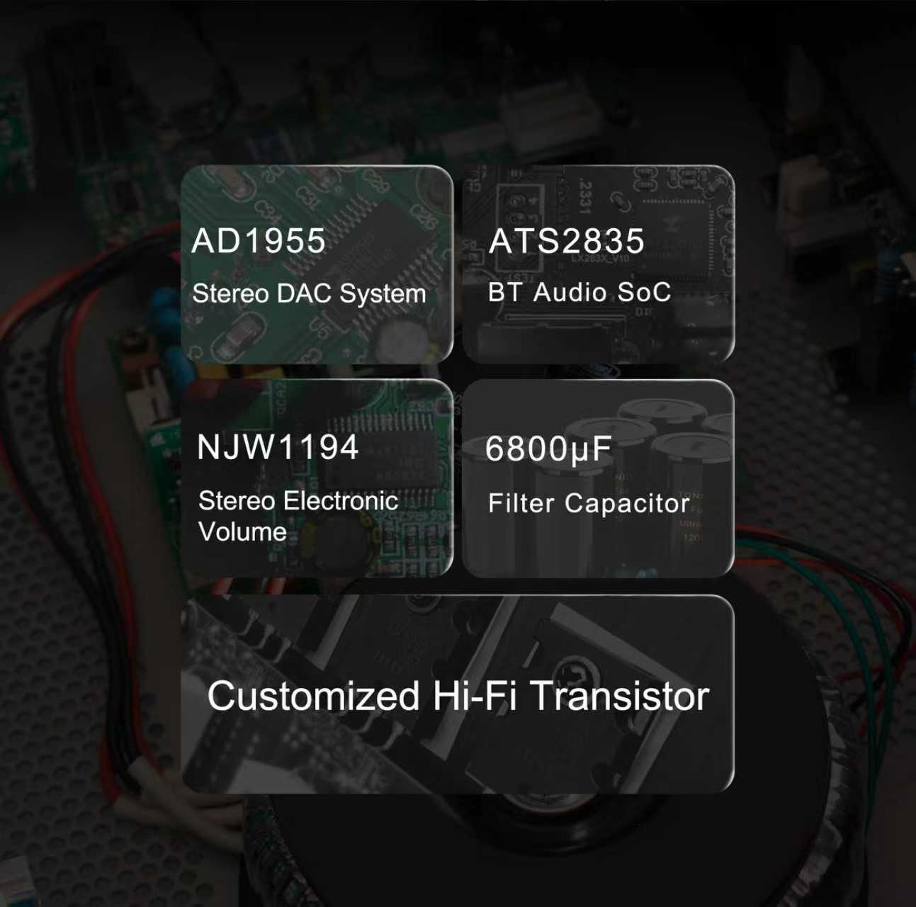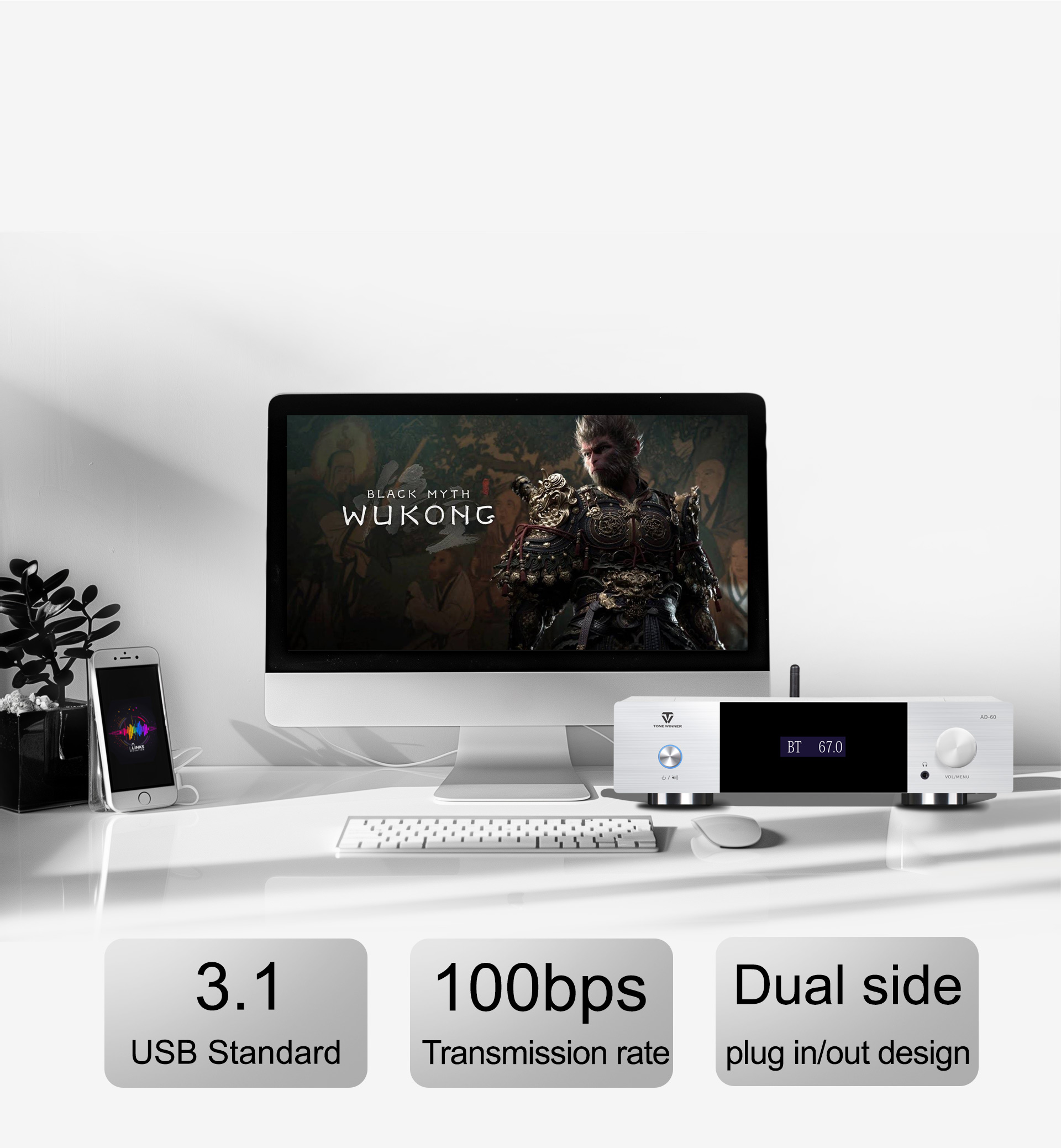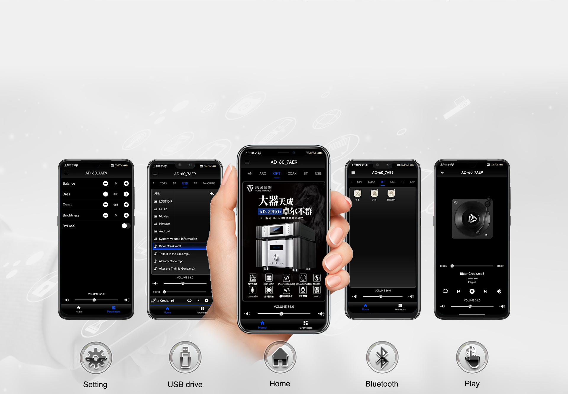 L'AD-60 est un amplificateur de puissance intégré de classe AB compatible avec les systèmes 2.1. Il combine préampli, amplificateur de puissance, lecture numérique et amplificateur pour écouteurs. Il prend en charge le Bluetooth 5.0, les clés USB, les cartes TF, le contrôle via application mobile et les entrées numériques (optique, coaxiale et USB-Audio PC). Conçu et fabriqué avec des matériaux et composants de qualité, il révèle un son analytique. C'est un amplificateur de puissance élégant et économique pour un son haute fidélité.