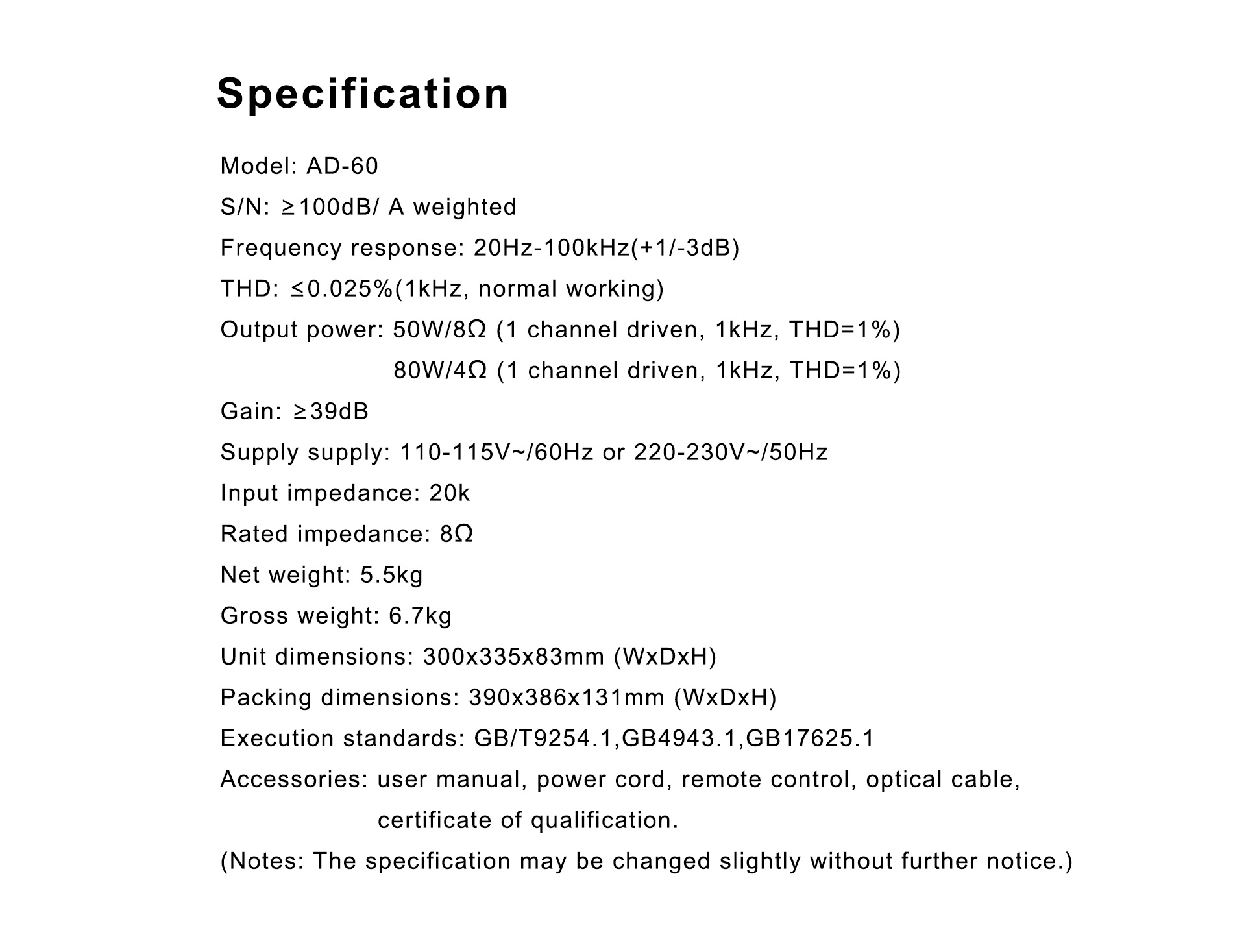 | Modèle | AD-60 | THD | ≤ 0,025 % (1 kHz, fonctionnement normal) |
