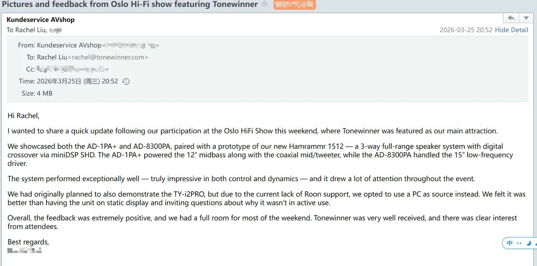 Suite à l'événement, notre distributeur local a envoyé un courriel faisant l'éloge de la qualité sonore exceptionnelle et des performances remarquables des amplificateurs Tonewinner, et exprimant sa pleine reconnaissance de nos produits lors du salon.