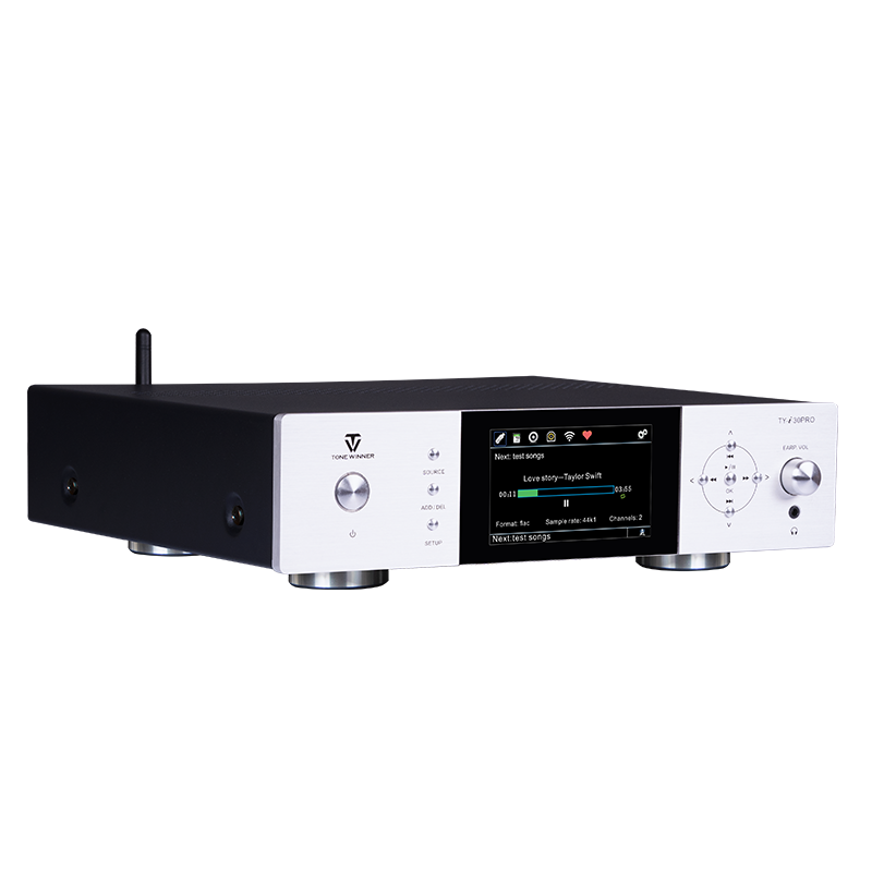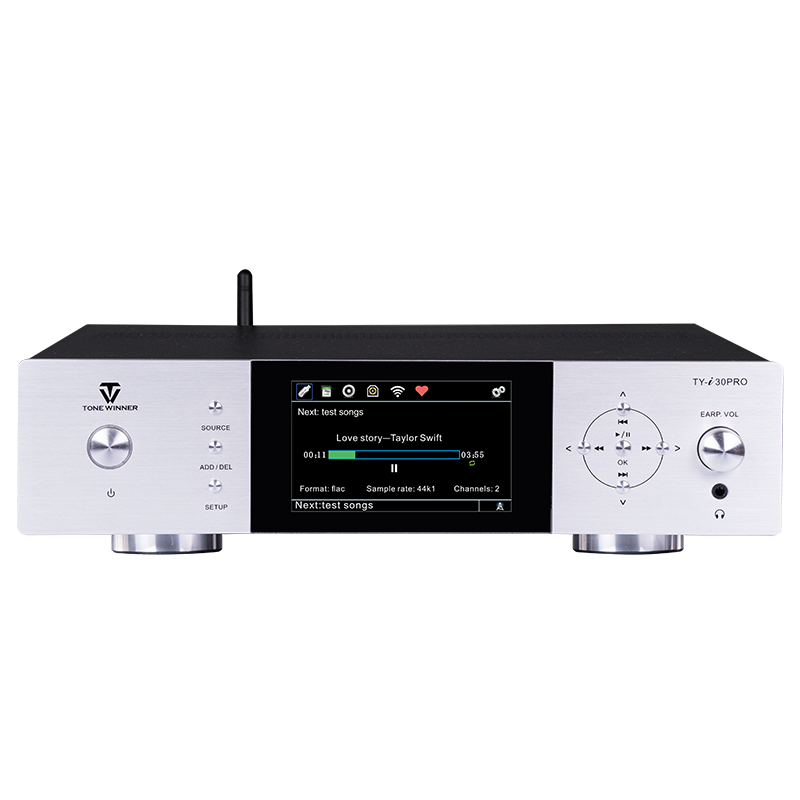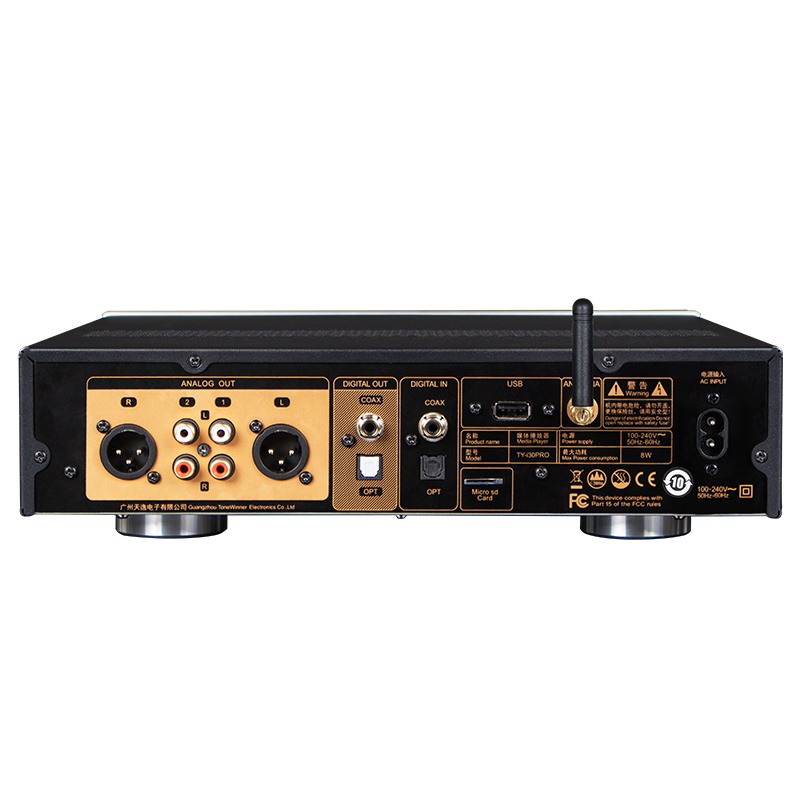 Le TY-i30PRO est un nouveau lecteur multimédia multifonctionnel lancé par ToneWinner. Il peut recevoir des morceaux diffusés depuis un téléphone portable, un iPad, un ordinateur portable et d'autres appareils via DLNA, AirPlay ou une connexion sans fil. Le TY-i30PRO prend en charge la lecture locale sur disque dur externe jusqu'à 2 To, carte microSD et clé USB, ainsi que les formats audio sans perte tels que WAV/FLAC et APE. Il est équipé d'une prise casque 3,5 mm en façade et prend en charge les entrées/sorties numériques optiques, coaxiales et PCM 192 kHz/24 bits.