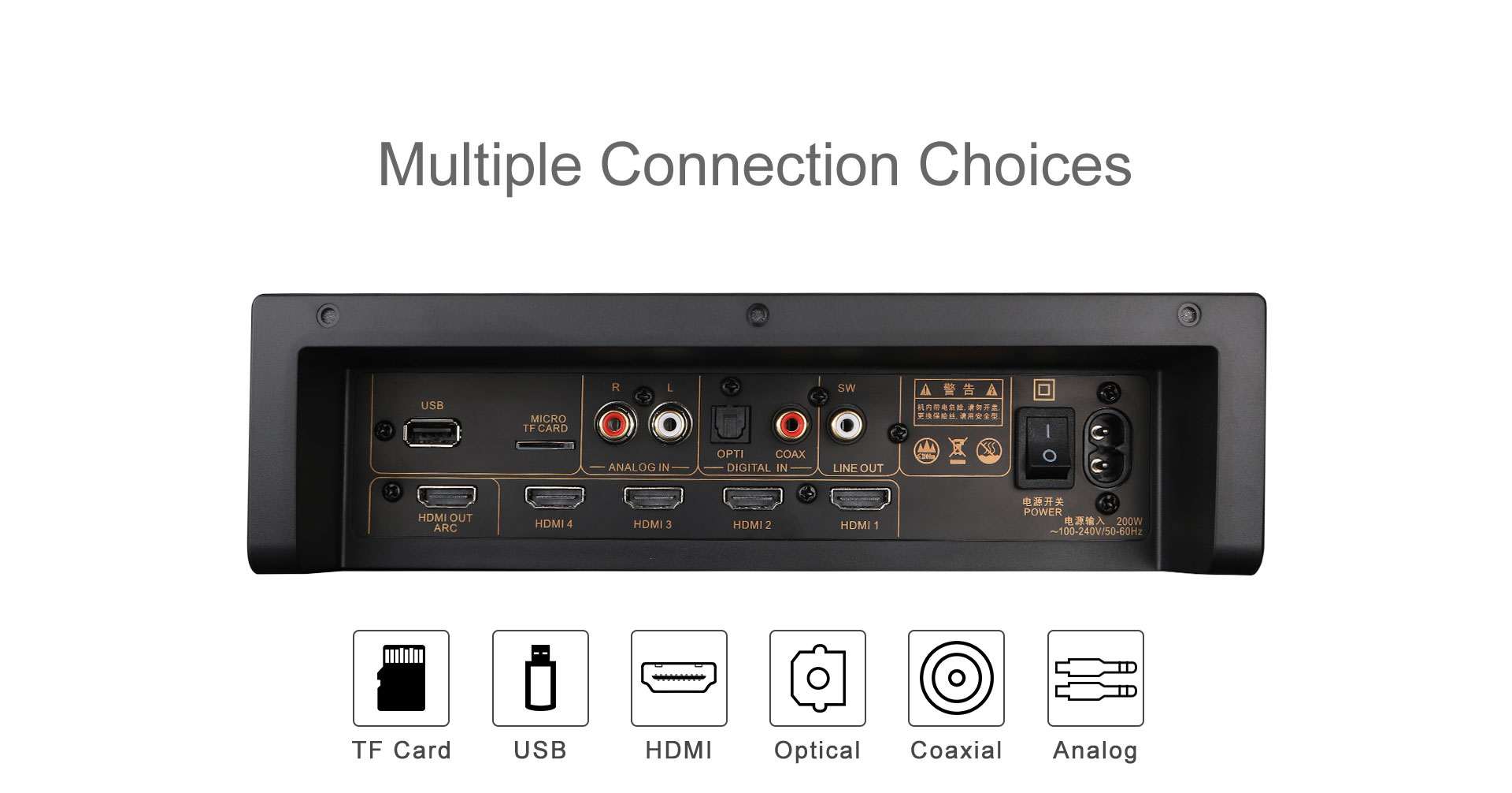 4 ports HDMI2. 1 , 1 port USB, 1 port carte TF, 1 port optique, 1 port coaxial, 1 port analogique. |