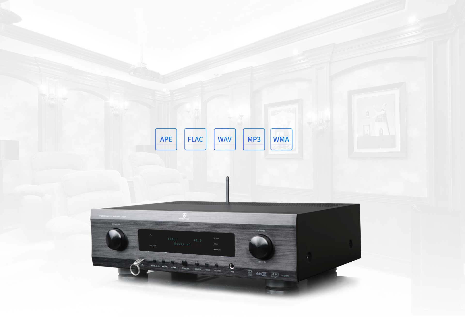 L'AT-200 est un Décodeur audio-vidéo intégré professionnel pour home cinéma et karaoké pour la configuration 7.1.4. Ceci Préamplificateur avec sortie subwoofer Pour le home cinéma, compatible avec Dolby Atmos, DTS:X et la technologie vidéo 4K. et est compatible avec la 3D, le HDR10, le Dolby Vision et d'autres formats vidéo. Il possède canaux professionnels 7.1.4 Effet karaoké immersif et prise en charge des effets audio externes.